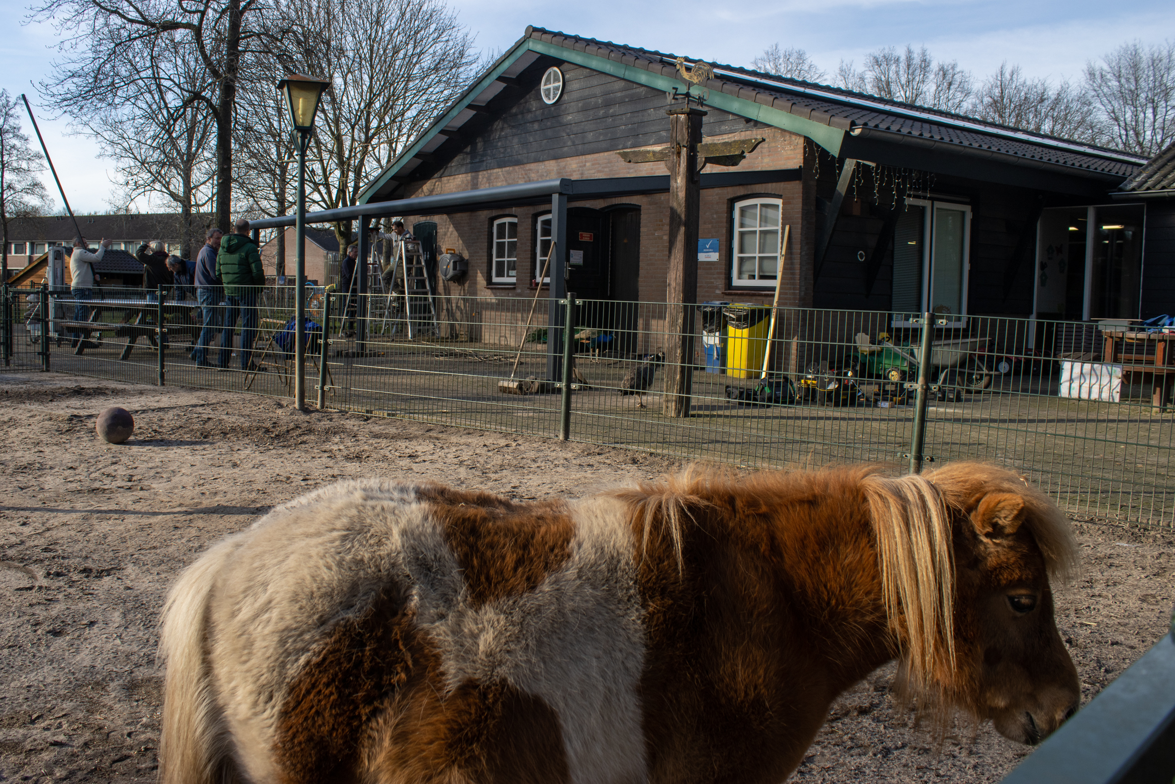 En wat helemaal mooi is: de overkapping is voor de volle 100% bekostigd met gulle gaven (in geld en handjes) van een aantal vrienden van ‘t Erf. We noemen hierbij in het bijzonder Lionsclub Waalwijk, RABO bank Clubsupport Waalwijk (de boombank moet even wachten), grondverzetbedrijf Verhagen uit Kaatsheuvel, Stichting Poncho, tweede hands kleding en de bijdragen van bezoekers in onze spaarbus bij het winkeltje. Er hoeft dus geen beroep te worden gedaan op het (toch al vrij krappe) beheersbudget. Duizendmaal dank, lieve vrienden. Mede door jullie inbreng, steeds maar weer, kunnen wij onze boerderij aantrekkelijk houden voor onze dieren en de vele bezoekers.